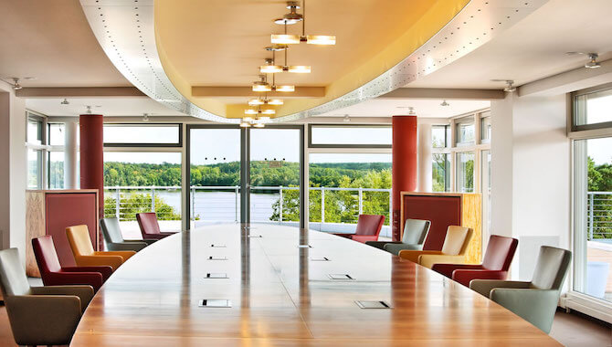 - Hauptraum Zeppelin Lounge mit ovalem Tisch und farblich abgesetzten Stühlen